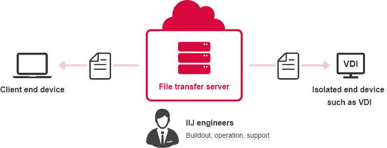 This service contains "FileZen S" by Soliton Systems as its engine. It provides a one-stop file transfer environment that is highly secure and easy for anyone to use. Also, since the dedicated IIJ engineers handle the buildout and operation of servers and networks, this service can be easily implemented.
