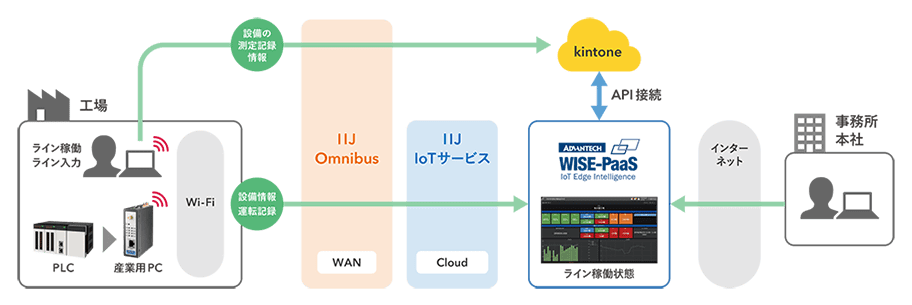 生産品質の向上を目的に、食品メーカの新設工場における、温度など設備情報やラインの稼働状況など運転記録をクラウドに集約し、一元的に管理・可視化する仕組みを導入。同時に、従来は工場のオペレータが現場で測定して、紙に記録・管理していた設備の運転情報を、クラウド型業務アプリ「kintone」に切り替えたうえで、IIJが提供するクラウドサービスとAPI接続することで、入力データの自動連携とペーパレス化を実現した。