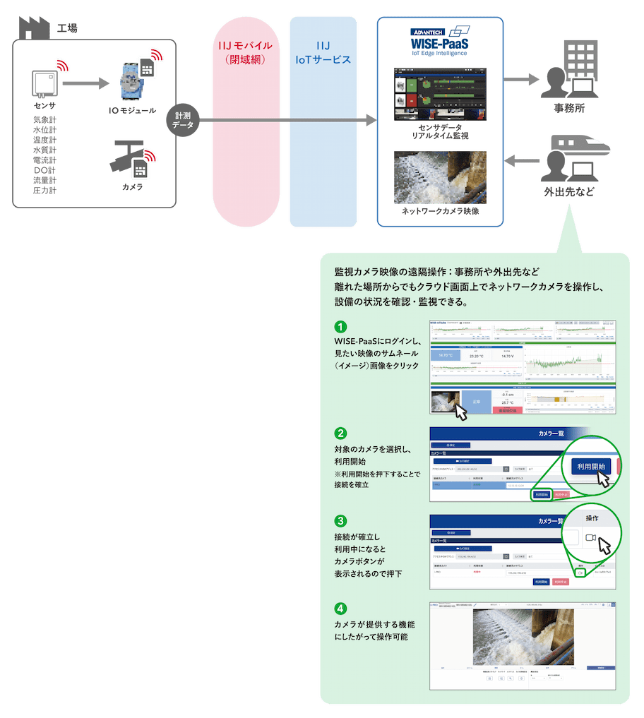 工場に環境モニタリングシステムを導入し、異常時にアラートを発報する仕組みを構築。これにより、設備管理業務の効率化をはじめ、外出中・夜間・休日に大雨や地震などが発生した際にも、遠隔から現場の状況確認が可能に。気象計・水質計・流量計など複数の計測器から得たデータをIOモジュールで集約してクラウドに送信し、さらに、新設したネットワークカメラの映像を統合画面でリアルタイムに閲覧できる仕組みを整えた。