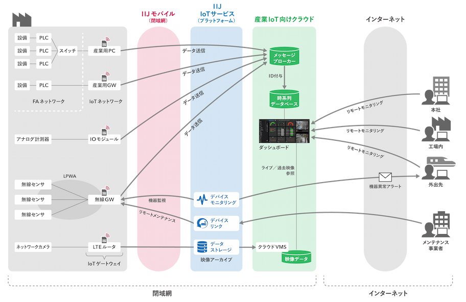 生産ラインのFAネットワーク*2に影響が出ないよう、IoTゲートウェイを境界としたIoT専用ネットワークを新設します。IoTゲートウェイはインターネットから隔離された閉域網でクラウド接続することで、スニッフィング(通信の盗聴)やデバイスへの不正アクセスのリスクを軽減します。また、モバイル通信(LTE)を活用することで、IoT導入時の配線・設置工事費を最小限に抑えます。