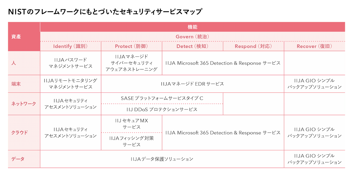 IIJ-Aでは、おもなIT資産(人・端末・ネットワーク・クラウド・データ)とNISTのフレームワークを組み合わせたうえで、最適なセキュリティ商材を項目ごとにマッピングし、お客さまのニーズに合ったサービスを提案しています。これにより、お客さまは自社の状況に応じてIIJ-Aのマネージドサービスを自由に組み合わせることができます。