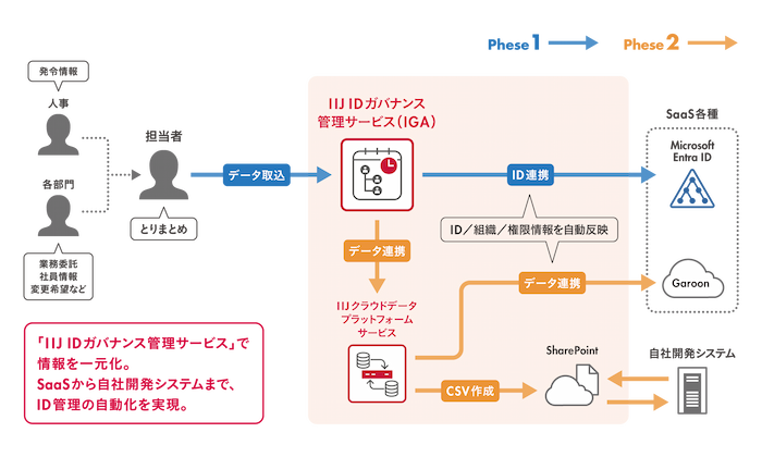 Phase2では、IGAに登録したID情報を、複数システムのデータを連携するiPaaS「IIJクラウドデータプラットフォームサービス」を介して各システムに展開し、APIを使って自社開発システムやGaroonとの連携を進めています。自社開発システムについては、IIJの同サービスで連携情報を取得・加工してCSVを作成し、Microsoft SharePoint Onlineを介して受け渡すことで、日々の運用を自動化しました。段階的に連携範囲を広げられた点も実運用の面で現実的でした。